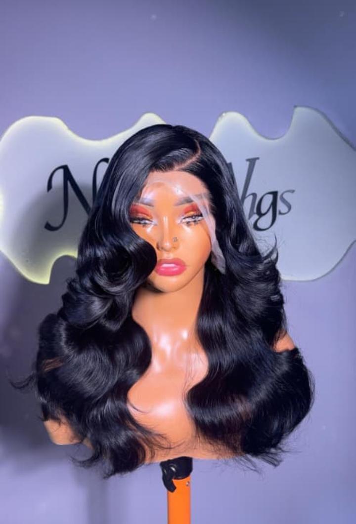 This is a luxurious long body wave wig with soft, voluminous curls that flow beautifully down the shoulders. It features a side part with a stylish layered fringe, giving it a glamorous and elegant look.
