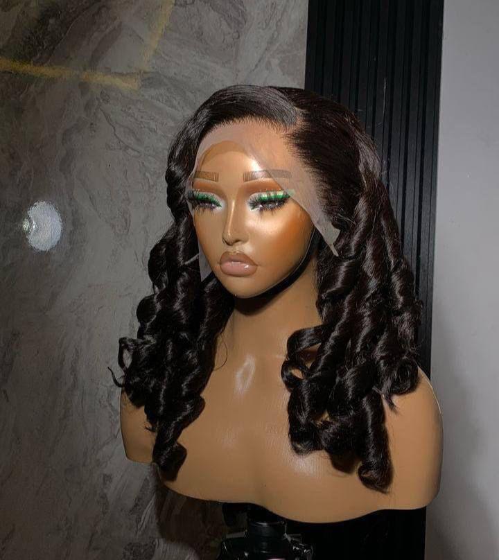 This is a luxurious long body wave wig with soft, voluminous curls that flow beautifully down the shoulders. It features a side part with a stylish layered fringe, giving it a glamorous and elegant look.